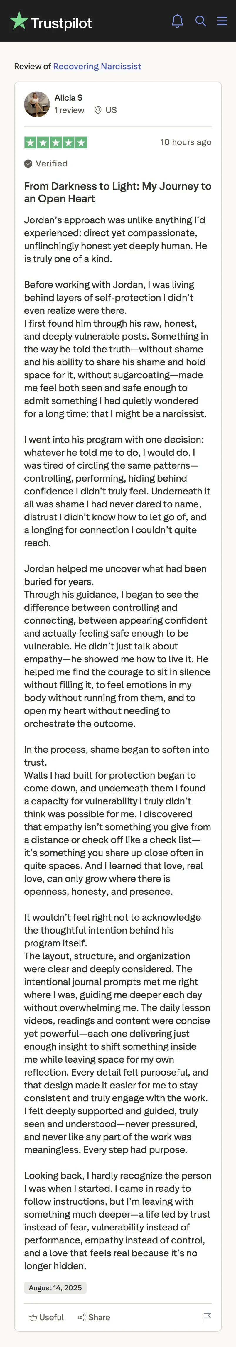 Narcissism created so much pain in my life and I get joy from helping others find the same healing that I did. Most people wake up to their narcissism when their life and relationship is in crisis. I created this program so that you don’t waste your time and energy on things that don’t help. I have already seen my clients improve their narcissistic tendencies, find inner peace, and outer connection at a way faster rate and with less frustration than I did. (See their reviews below!) My program is for people with narcissistic traits who want to reduce the following in their lives: